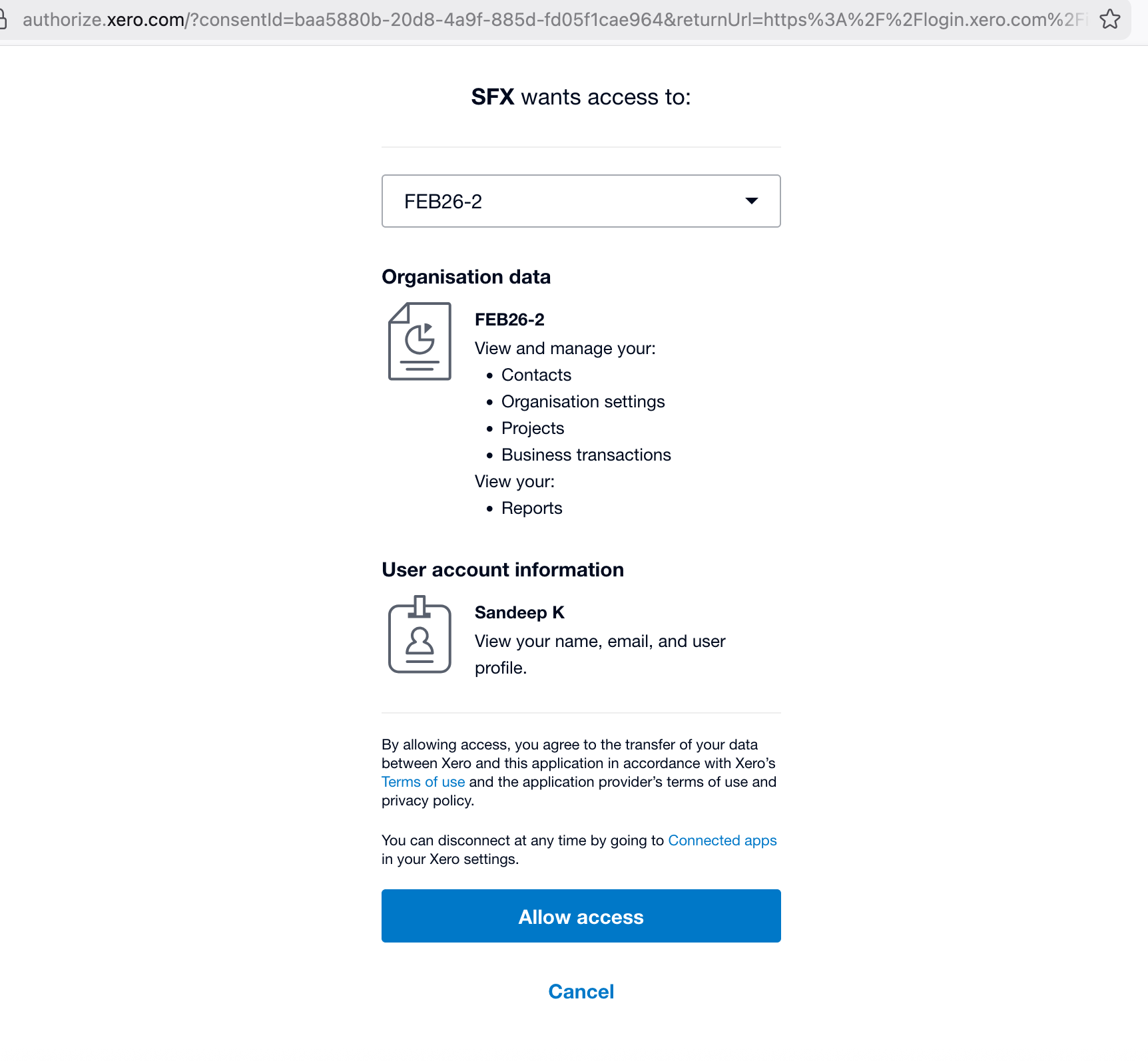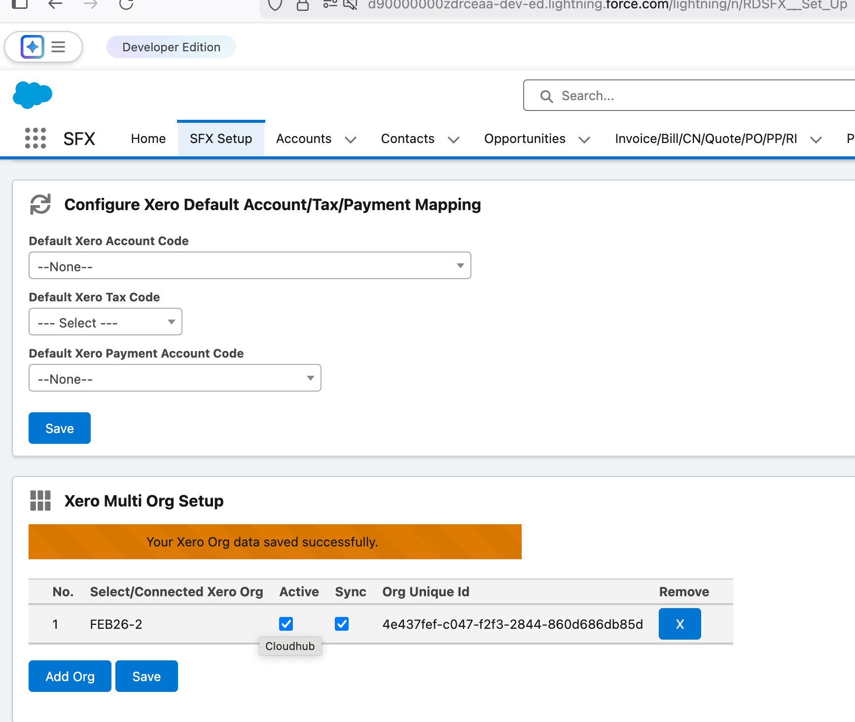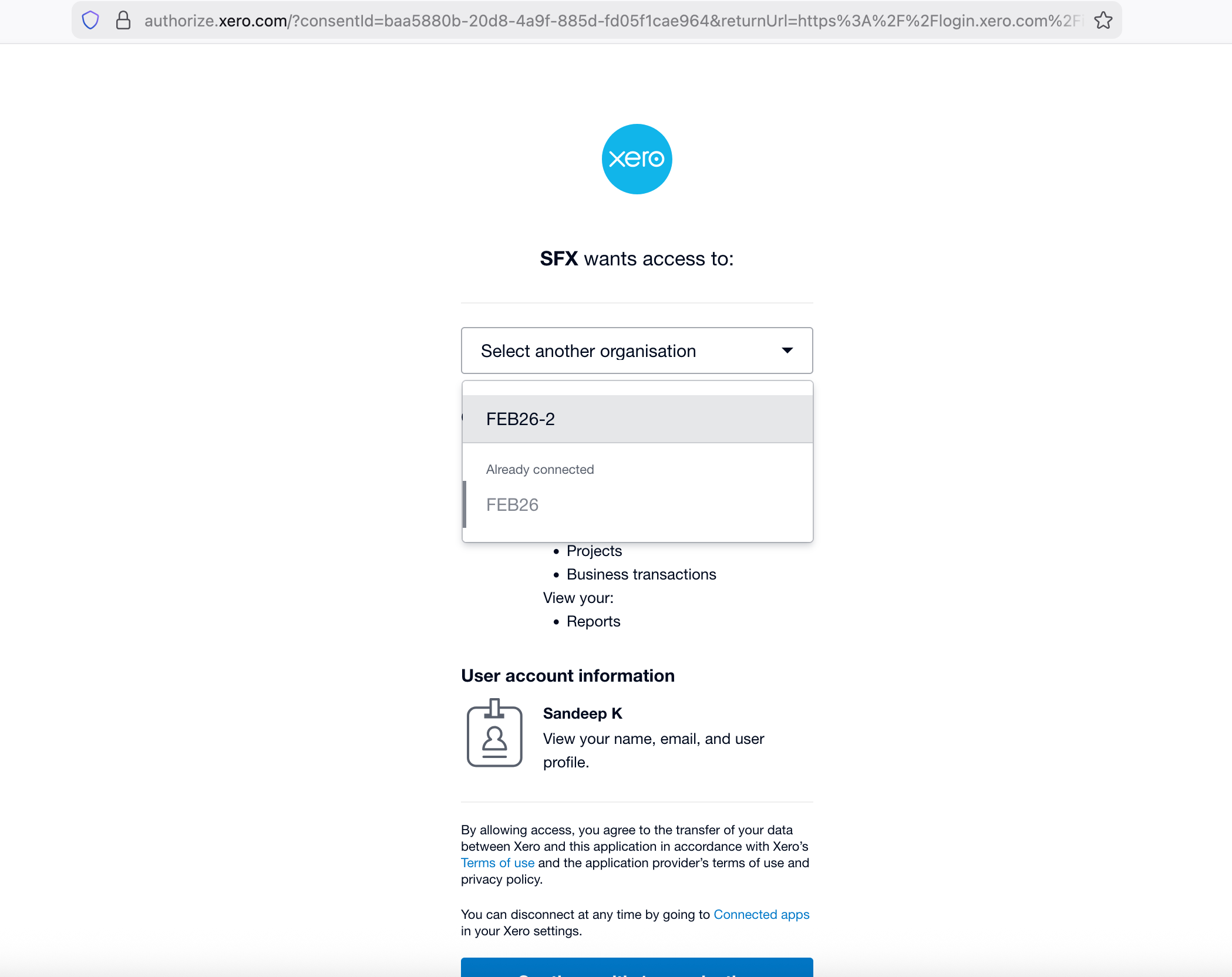 Following this step, back on the SFX Setup tab, click on [ Select/Change Xero Org ]
