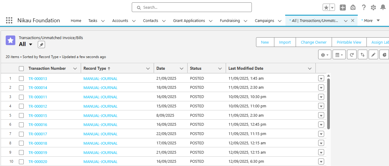 - In Salesforce, navigate to the Transactions/Unmatched Invoice/Bills tab and Tran/Unmatched Invoice/Bill object where you can view synced journals.
