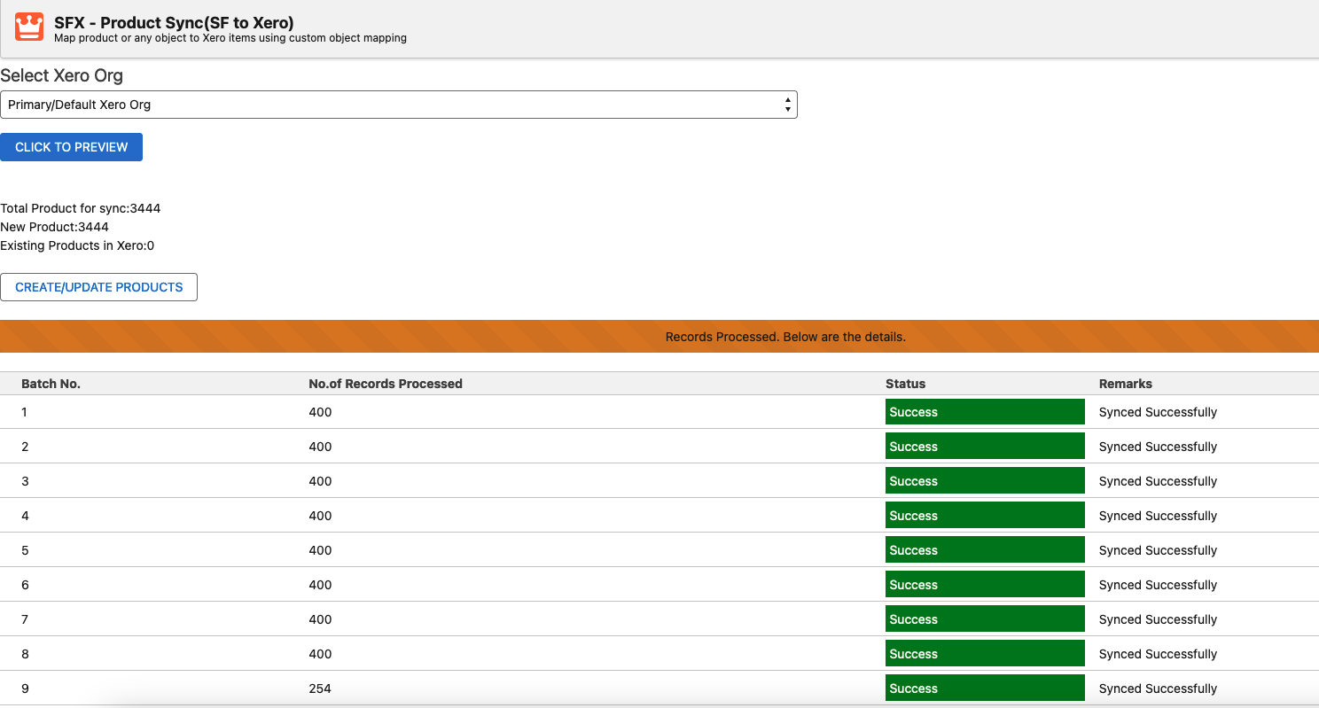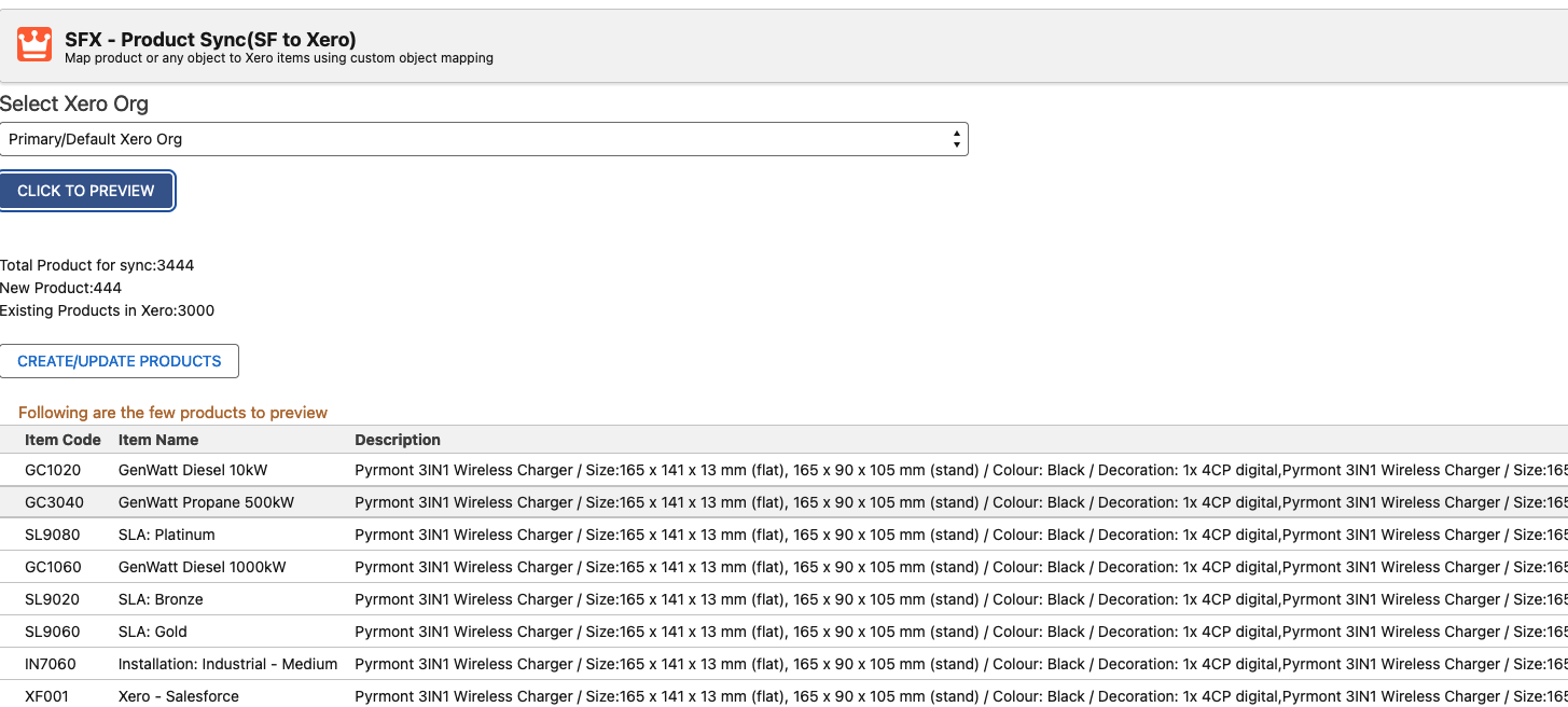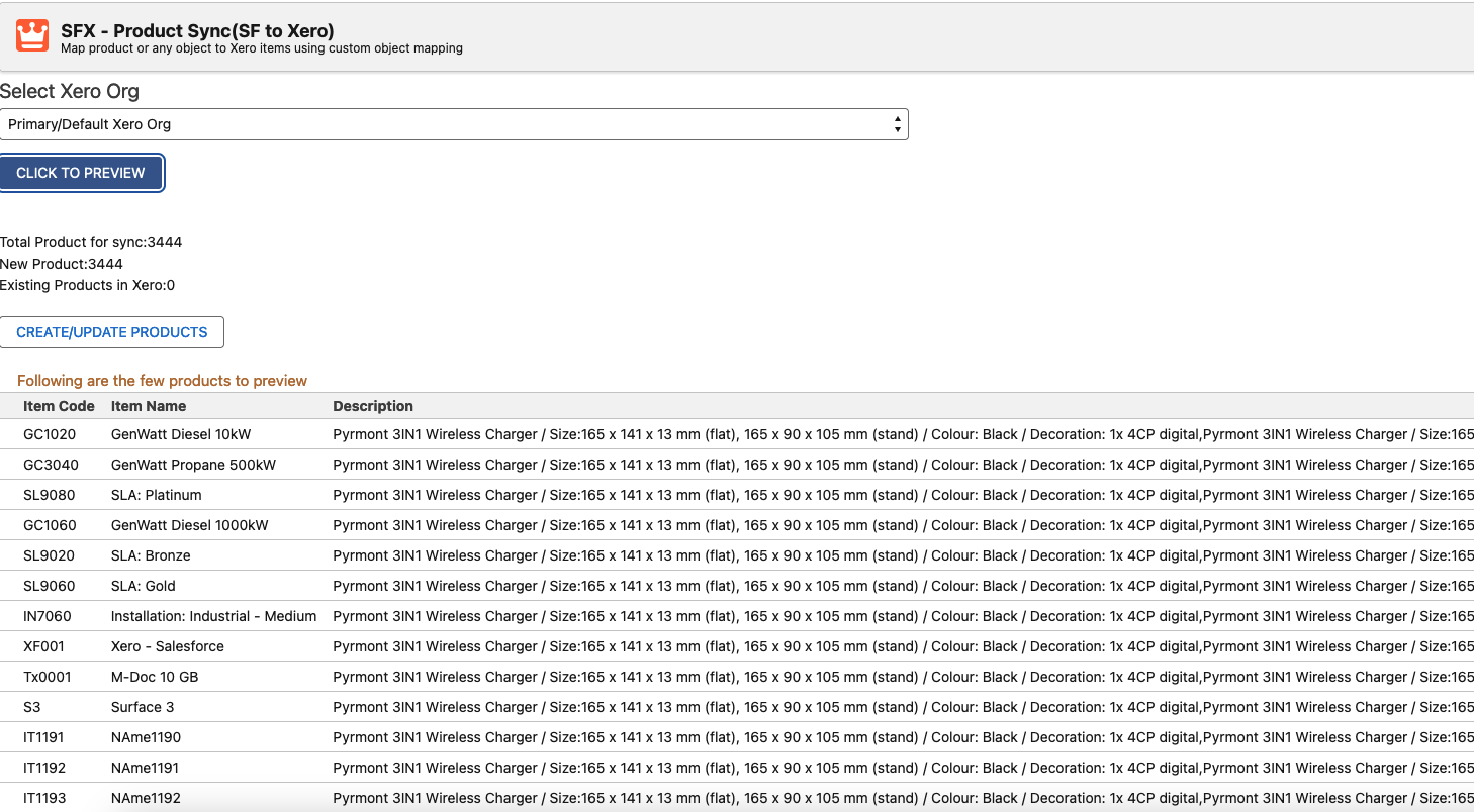 If everything looks correct, click "Create/Update Products" to push the products to Xero.