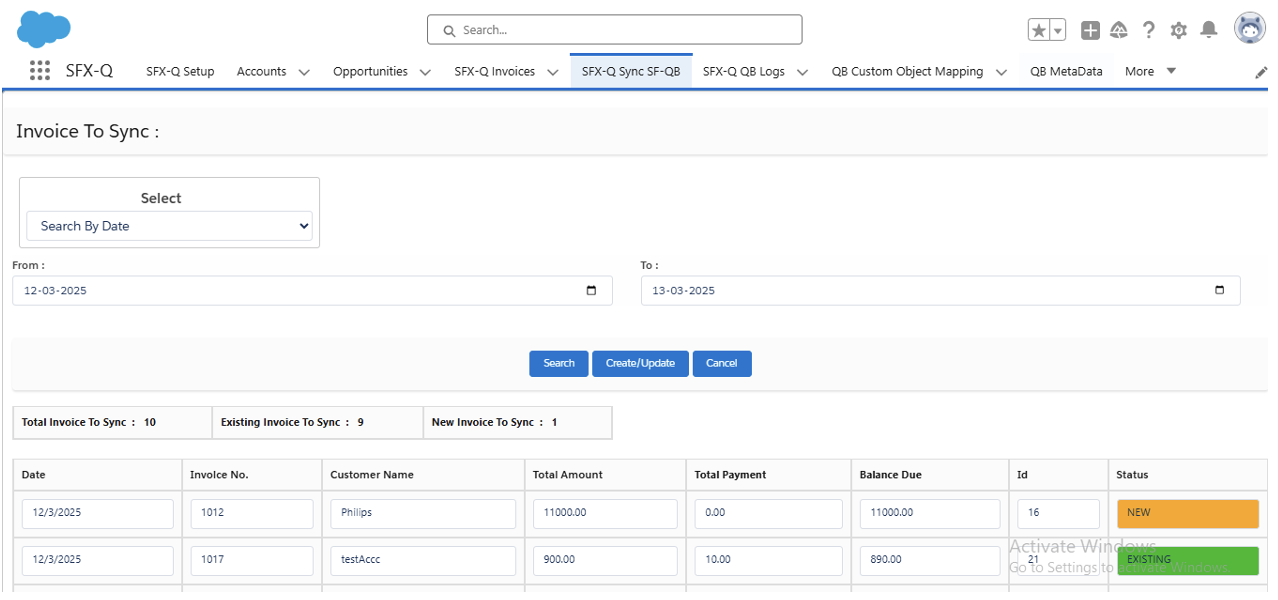 Open the desired Invoice Record in Salesforce, click the Sync button on the record, and the selected invoice data will be synced from QuickBooks to Salesforce.